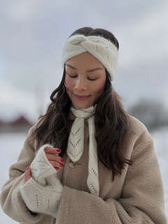 The white Celestine Set in the pictures is knitted in Merino and Soft Silk Mohair (Color: Cream) from Knitting for Olive. This is the size “Narrow, long scarf”.