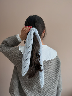 The blue Celestine Scarf is knitted in 1 strand of Soft Silk Mohair from Knitting for Olive (Col. Cream) and 1 strand of Tynn Silk Mohair from Sandnes Garn (Col. 6012 Summer Sky). This is the size “Narrow, short scarf”.