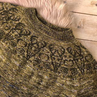 The idea for this sweater came from the yarn that I was using. The variegated green and brown colors made me think of a forest floor, and because you know I love spooky animals, I designed a deer skull hidden beneath a layer of moss, lichen and flowers. I took the name Cernunnos from an ancient Celtic god depicted as a man with deer antlers - Cernunnos has been interpreted as a symbol of the underworld, or as a symbol of fertility, and I felt that the name fit the motif of nature growing over the skull.