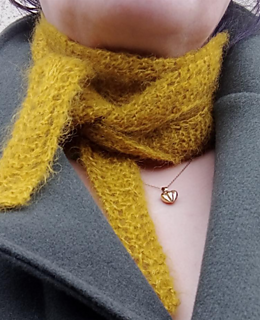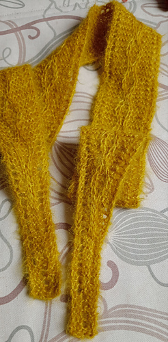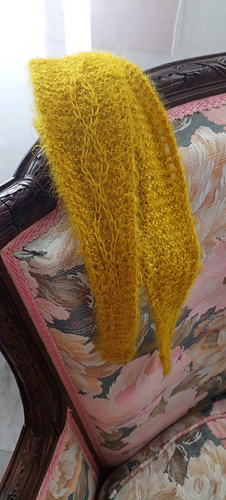 The scarf pictured was made with “Honey Moon” kid silk mohair from Anny Blatt.