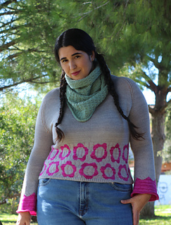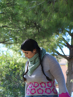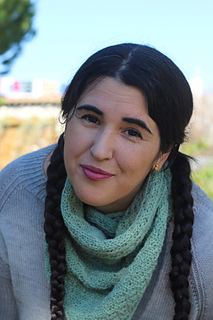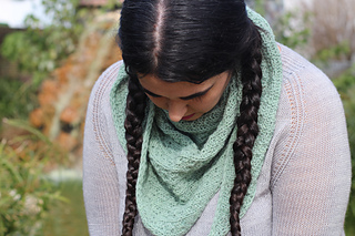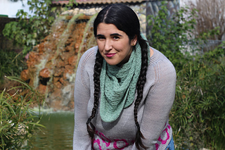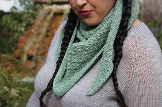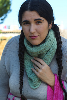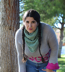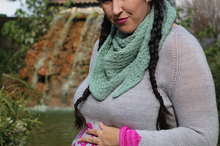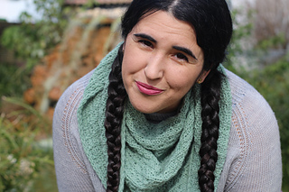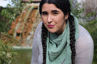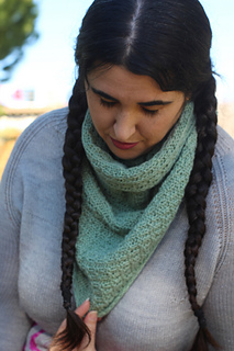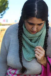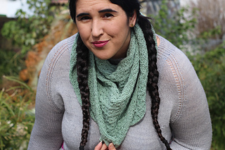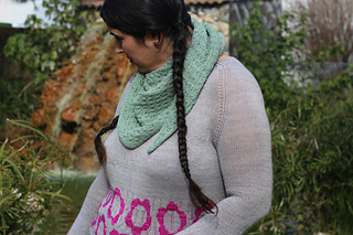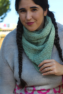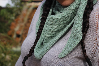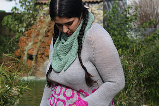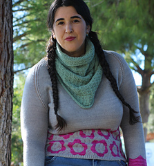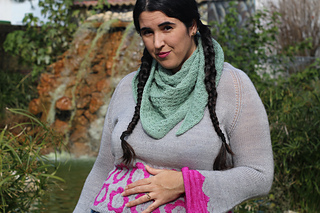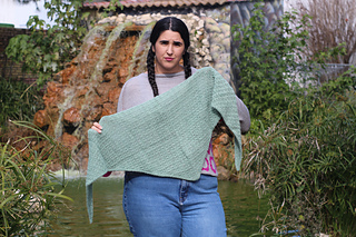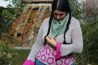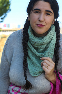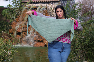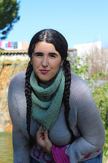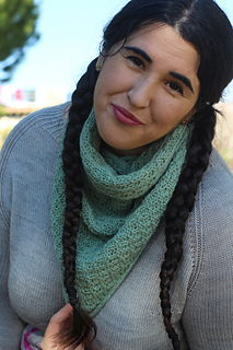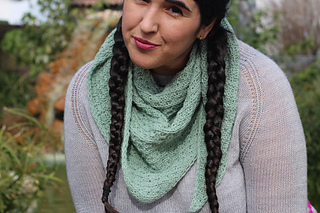 Es un chal tipo pañoleta, con los aumentos solo a un lado de la labor, con un icord a ambos lados que se forma mientras vas tejiendo. En el cuerpo del chal se va formando una textura en relieve dibujada con puntos del derecho y del revés. Comienza con pocos puntos y se va aumentando hasta que nos queda poco más de la mitad del material disponible, ahí comenzamos a disminuir hasta llegar al final del chal.