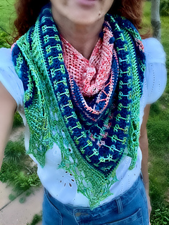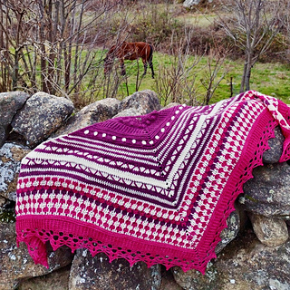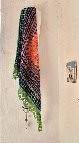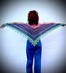 Este chal se teje desde el centro de la parte superior y va aumentando hasta llegar a la parte del borde, combinando colores y texturas, puntos especiales descritos en el patrón, con gráfico de apoyo