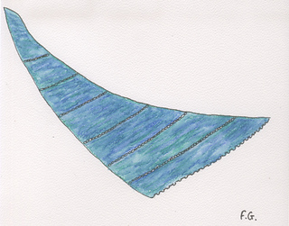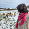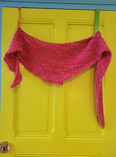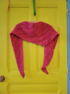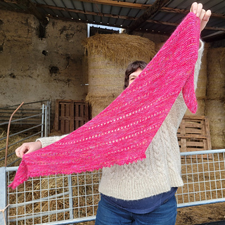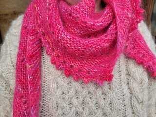 Il s’agit d’un châle triangle asymétrique peu profond et long, qui débute de la pointe et se tricote vers la base.