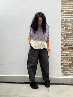Esta prenda se teje en dos piezas separadas por lo que se puede trabajar en abierto o en redondo. Es un diseño down-top que posteriormente se coserá por los costados y hombros.