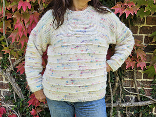 C’est un modèle simple à réaliser, accessible aux débutants avec une alternance de point mousse et de jersey pour un résultat de gros pull doudou et confortable.