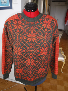 The gauges were achieved with the following needles. To work the pattern as written, you must swatch and use a needle size that will result in the correct gauge after blocking. The underarm of the sleeves is worked in plain stockinette. If you do not know whether your stockinette gauge tends to be different than your colourwork gauge, I suggest making a single‐colour swatch in addition to your colourwork swatch to compare gauges. If it is different, then you need to go down one to two needle sizes for the single‐colour rows under the arm and the pattern is written as such.