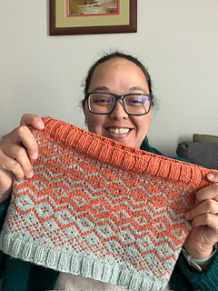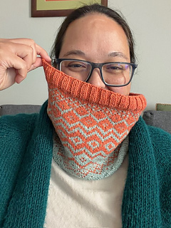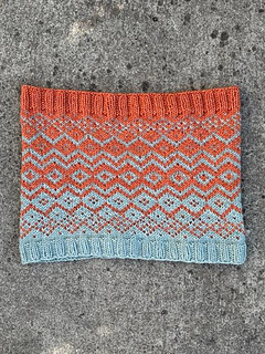 The Changeover Cowl was inspired by the transition between the two colors used in the design using a mirrored image of the colorwork.