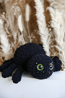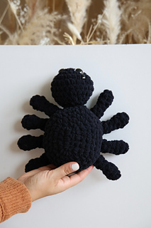 The finished spider measures roughly 8.5” long (from head to back of the body) by 9” wide (from tip of one leg to the tip of the other).