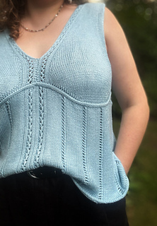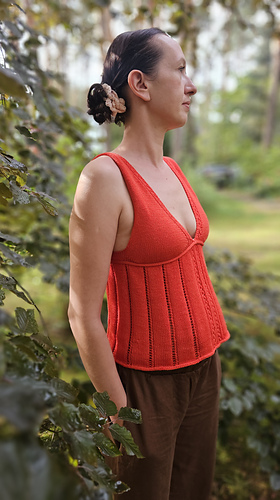 Nabieramy oczka obu przodów i przerabiamy tył, dodajemy oczka pod pachami i łączymy wszystkie trzy części. Formujemy biust rzędami skróconymi