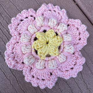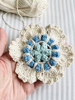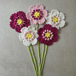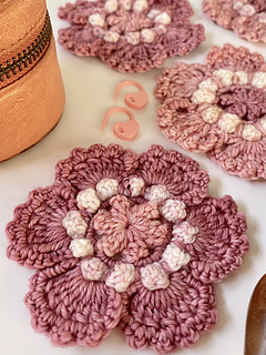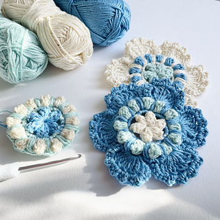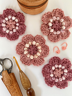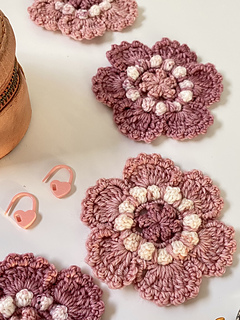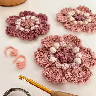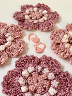 These versatile and very pretty flowers only use a small amount of yarn per flower (20m total if you’re using fingering weight), and are quick to work up.