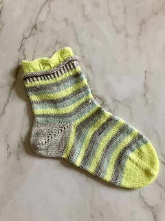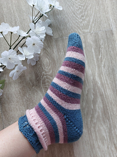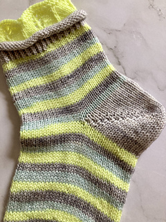 Les chaussettes Kiss Cool sont réalisées de la pointe vers les côtes. Le talon est réalisé en rangs raccourcis selon la technique du Shadow Wrap Heel.