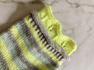 Vous réaliserez une première bordure en couleur contrastante, avec quelques rangs de côtes, puis un bord roulotté.