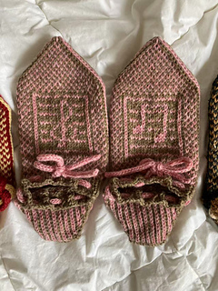 Some pretty little slippers that are a little bit felted: It’ll be a very nice gift! Begun with “Judy magic cast on”, they’re all worked in round, except when stitches are put on hold for ankle hole.