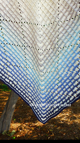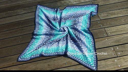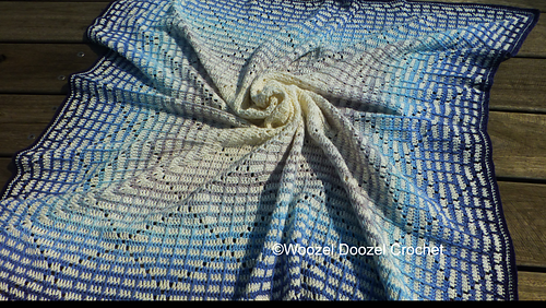 A baby blanket worked from the middle out. Uses standard stitches in US terminology. (dc, sc, ch, sl st) and also uses front post stitches (fptr, fpdc).