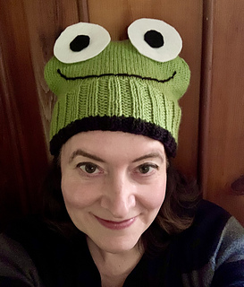 Hat is knit in the round. After the ribbing, a line of purl stitches on each side creates a fold line in the stockinette to encourage the flatness of the frog face. A series of decreases on each side of the purls create the shape of cheeks. The top is bound off with 3-needle bind off.