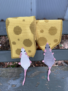 I used 4 Seasons Pure Entwine Wool in Yellow (approx 300g) for the main colour of the cheese, and in colour Mustard (approx 150g) for the border and cheese holes. I then used Marvel 8 Ply Acrylic in colours Cream and Grey (approx 20g) for the bodies of the two rats, and Pink (approx 10g) for the rats nose, feet and tails.