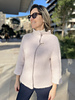 This jacket has a boxy shape, three quarter sleeves, and folded collar, cuffs and hem.