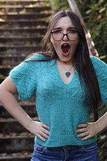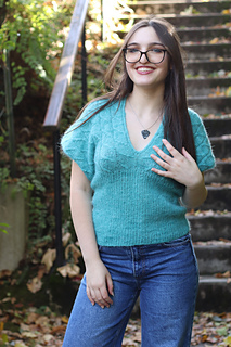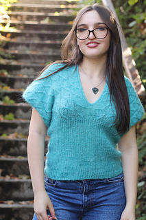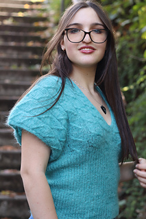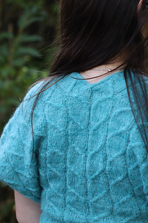 Son motif entièrement composé de torsades structure le devant et le dos dans un rythme fluide, mis en valeur par une large bande de côtes en bas du corps qui ancre la silhouette. À la fois léger et texturé, c’est un modèle qui conjugue délicatesse et caractère.