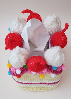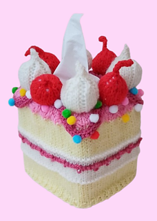 The Cherry Cake Tissue Box Cover is a novelty knitting pattern that disguises a tissue box as a delicious slice of Victoria sponge; perfect for gifting or display.