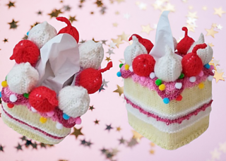 Worked flat in one piece using DK yarn and 4mm needles, the main cover is seamed neatly up one corner. Decorative elements including rosettes of icing, cherries and drizzle; are knitted separately and sewn on, while the sprinkles are made from ready-to-use 10mm pompoms for added texture and charm.