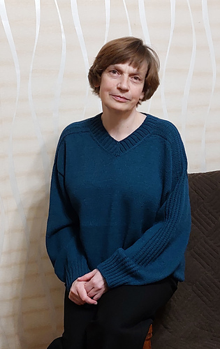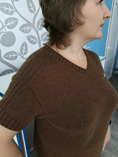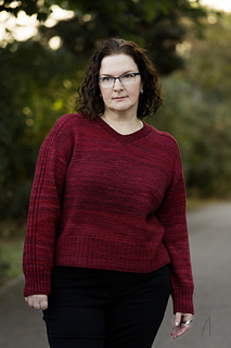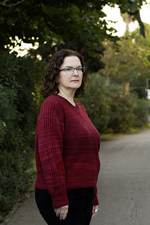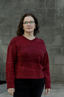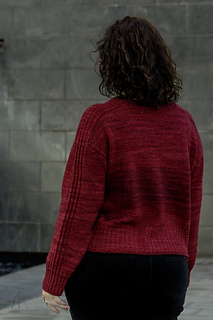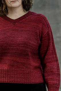 Cherry Tart pullover is seamless; it is worked top down and in the round. First, the shoulder panels are knit, then back and front stitches are picked up from the panels edges, and worked separately until underarms. They are joined in the round, and the body is worked until the desired length. Neckband and sleeves stitches are picked up from the edge of the body and worked in the round.