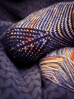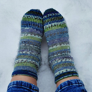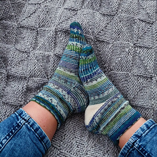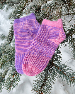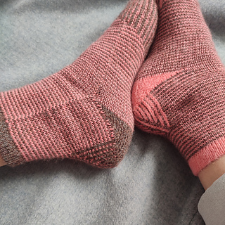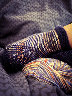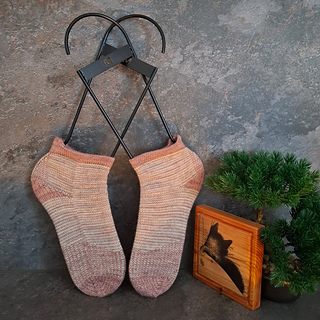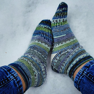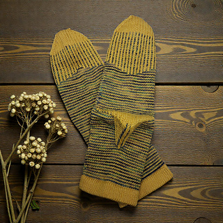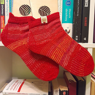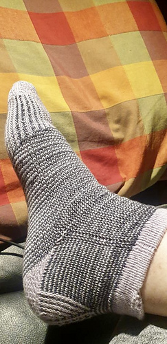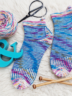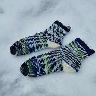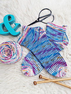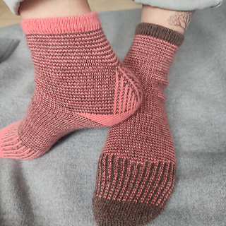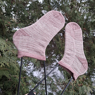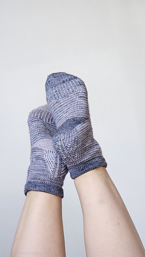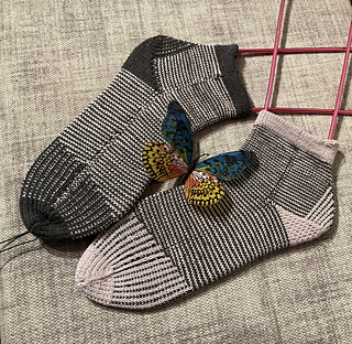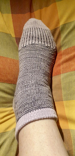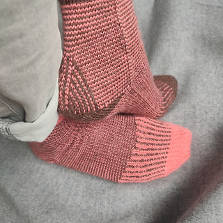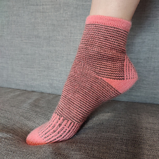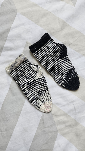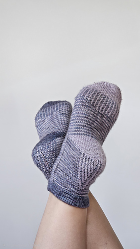 heshire Cat Socks are worked cuff down socks in stockinette stitch. Their whole decoration are thin stripes in multiple directions, also in strengthened triangle heel and sole construction details.