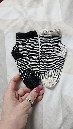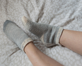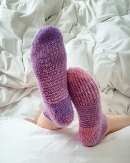 For kid sizes you need 20 - 25g/0.7 - 0.9oz of yarn in main color and 15 - 20g/0.6 - 0.7oz in contrasting color, and adult sizes you need 30 - 50g/1.1 - 1.8oz in main color and 25 - 45g/0.9 - 1.6oz in contrasting color (depends on foot dimensions).