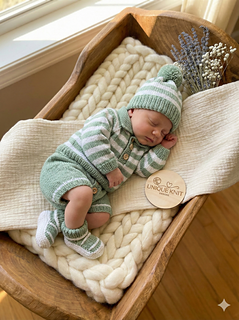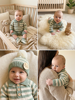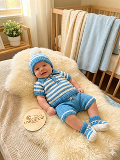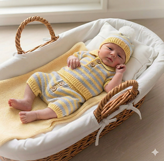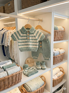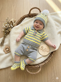 This beautiful 4 piece set is a delight to knit. the striped top is knitted from the top down on single-pointed needles. This pattern has clear line by line instructions. The simple memorable stitch pattern makes this set easy to knit and ideal for knitting whilst watching TV.