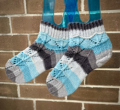 These Aran-weight socks are knit cuff down with a short row heel, using Magic Loop method. They are a fast knit and will keep your feet warm and comfy.