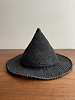 a witch hat on the shorter side. it’s made with a double-weight raffia yarn and a smaller hook, resulting in a dense yet lightweight texture that stands up straight.