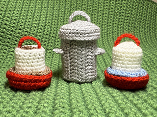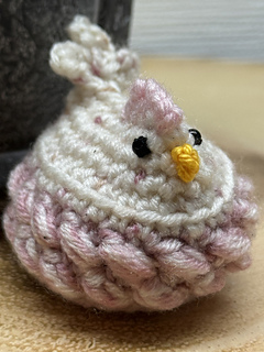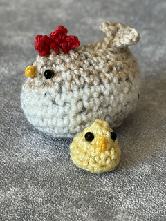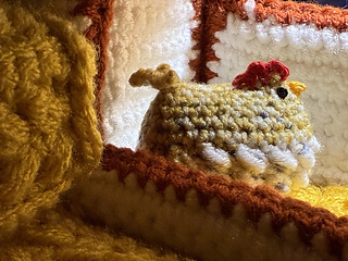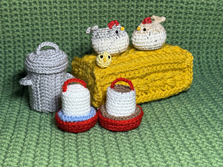 The finished chicken coop, when worked in two strands of double knit yarn, will measure approximately 10”/25cm high and 12”/30cm wide by 12”/30cm deep. This will of course vary with weights of yarn and hook/tension.