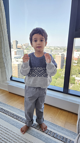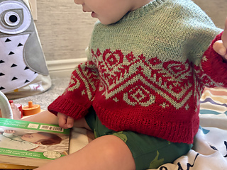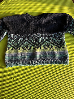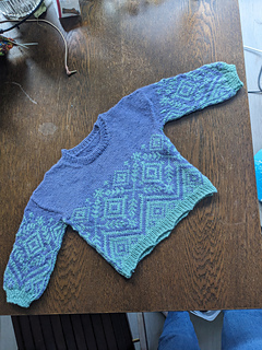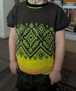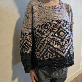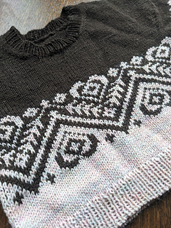 Start by casting on stitches for the back, work back shoulder shaping with short rows, and then work gentle armhole shaping. Pick up stitches for the fronts, again work some shoulder shaping with short rows, work increases to shape the neckline, and cast on stitches at the center front to join the fronts. The front armholes are shaped just like the back armholes. Stitches are cast on for the underarms, and the body is knit in the round. The second color is joined and colorwork begins. The background color transitions to the second color as the colorwork progresses. The body is then knit a bit longer in stockinette, and is finished with a ribbed hem.