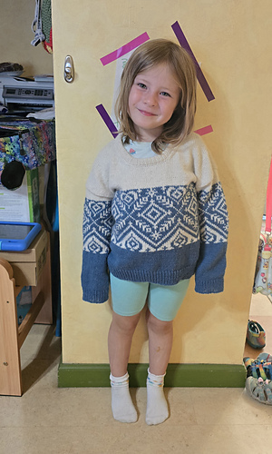 The pullover is meant to be worn with 4.25” / 10.5 cm of positive ease at the chest. The pullover’s shoulders are meant to drop 2.5” / 6 cm past the shoulder.