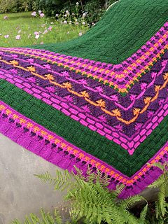 The Chili Blossoms are made from below knit stitches which bloom on a top-down triangular scarf. They are embedded in various slipped stitches and structural patterns which make for a varied knitting process.