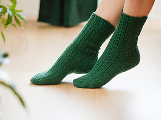 INTERMEDIATE: Project is worked in the round from the cuff down and includes cables, slipped stitches, increases, and decreases. Kitchener stitch is used to finish off the toe. The pattern is primarily charted.
