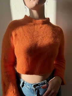 The sweater is worked top down in the round with a folded picot neckband, short-row shaping at the neck, and increases along the sleeves and body. The sleeves and body are also finished with folded picot edges.