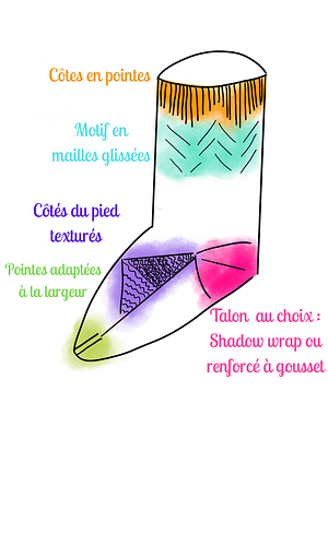 Note : cette quantité est approximative et dépend de plusieurs paramètres (pointure, épaisseur de la laine, tension, longueur de la tige …) Vous pouvez faire votre talon et votre pointe avec une couleur contrastante.