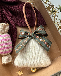 The Christmas Bell is worked in the round from the bottom up using the Magic Loop technique. The bell is stuffed with scraps of yarn and grafted together along the bottom and the top. At the end, a jingle bell is attached at the bottom, and a bow and a leather strap are attached at the top.