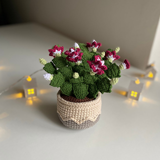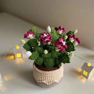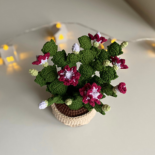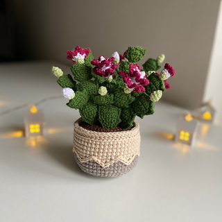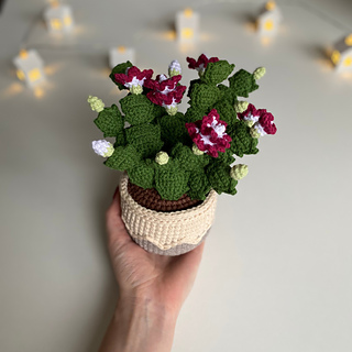 Bring a bit of tropical elegance into your home with this beautifully crocheted Christmas Cactus (Schlumbergera)! This charming soft succulent features 8 carefully shaped stems, each decorated with delicate flowers and buds, creating a realistic and vibrant look. The cactus sits in a stylish pot with an eye-catching motif, making it a lovely accent piece for any room.