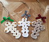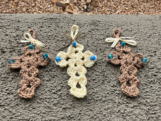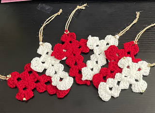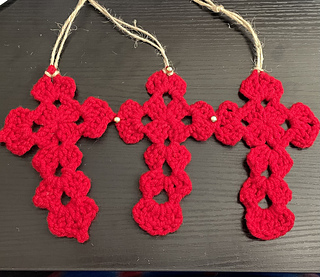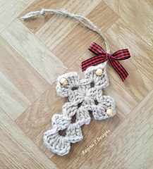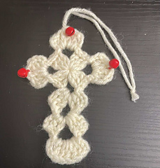 Work this cute granny style cross up quickly with the scraps you have on hand and spruce up your tree or packages with a handmade addition this holiday season. Feel free to add any accents you like to make yours uniquely your own. Finished cross should measure between 4” & 5”, not counting the hanger, depending on your yarn choice & tension.