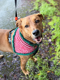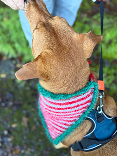 This beginner-friendly knitting pattern shows you how to make an adorable striped elf-style dog bandana with classic red and white stripes, a fluffy green ruffle, and a touch of sparkle.