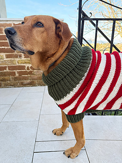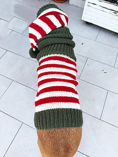 This festive knitted dog sweater features bold red, green, and white stripes, a cozy ribbed neck, and the option to add sleeves—perfect for winter walks, Christmas photos, and snuggly evenings at home.