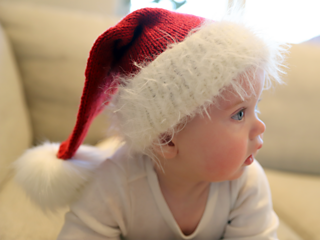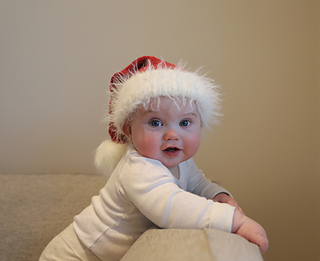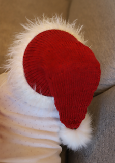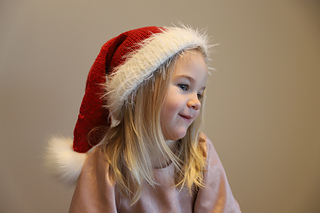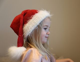 The 2025 Christmas hat is simple and quick to make, knitted from the bottom up. Begin with a ribbing knitted in white and fun fuzzy yarn. Then the hat is knitted in stockinette stitch with one color and decreases are made so that the hat narrows as the tail lengthens.