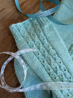 The Christmas Ribbon socks are my annual Christmas Sock design using Birdstreet Yarn. This year I chose a beautiful pale aqua colourway, to design with, called Iced on their merino nylon stellina base. This colour way reminded me of a certain large New York jewellery store and the lovely ribbons they tie their packages up with. The twisted stitches that I used to form the ‘ribbons’ down the front of the socks are a simple and memorable making these an ideal Christmas cast on or gift knit. This design particularly suits tonal or lightly speckled yarns.