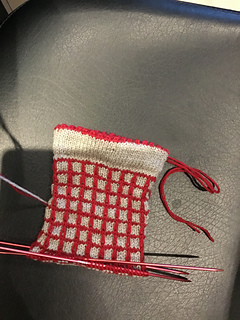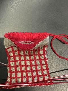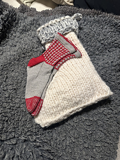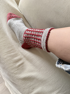 The socks folded cuff has a contrasting color on the inside. It can be knitted down or sewn down. The leg is worked in stockinette stitch with slipped stitches.