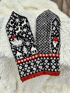 34 m = 10 cm. Pinner 2 til vrangbord og 2.5 (str S og M) 3 (str L) til resten av votten.