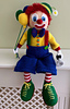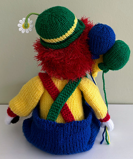 Chuckles the clown will bring a smile to all that see him. He is weighted so that he will sit happily on a shelf. He measures 29cm not including the legs. DK yarn is used plus fur yarn for the hair.