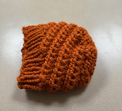 This is a spiral rib hat knitted in the round with super chunky yarn. Knits quickly. Uses Knit stitch, Purl stitch, Purl 2 together, and one M1 (make 1) stitch.