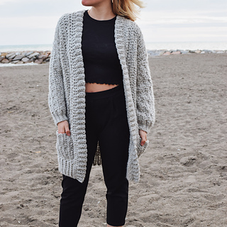 You will need approx. 15, 17, 20, 23 balls of Drops Design’s “Wish” yarn, or approx. 1155, 1310, 1540, 1770 yards (optional pockets included) of any weight Bulky/Chunky/12 ply weight yarn.