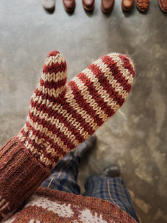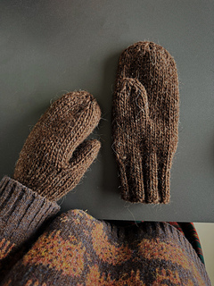The mittens are knitted in the round and can be entirely purled or knitted, according to your preferred method. Most Portuguese-style knitters prefer purling on the wrong side of the garment. Because both techniques can be used, the pattern uses work (x sts/rounds) instead of purl or knit (x sts/rounds).